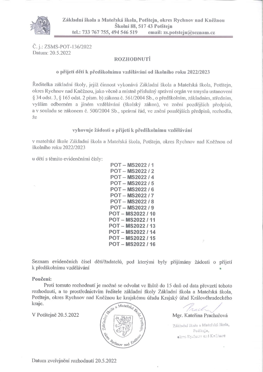 Úvod > Mateřská škola > Aktuality MŠ > Rozhodnutí o přijetí 2022