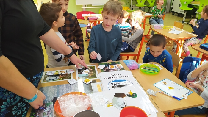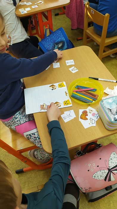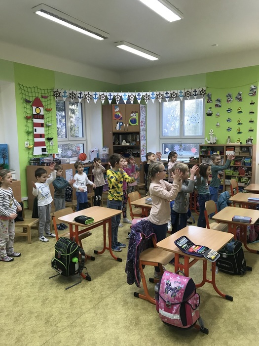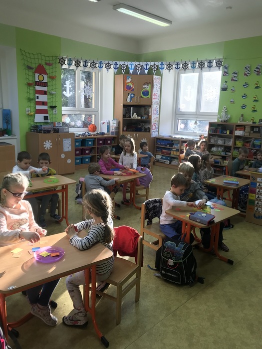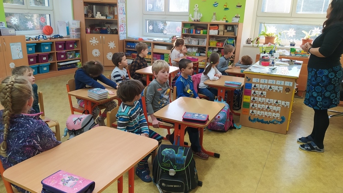 Ve dnech 10. a 11. ledna byli předškoláci na návštěvě v 1. třídě. Zúčastnili jsme se hodin matematiky. Každý prvňák si pozval školkáčka ke své lavici a společně pak pracovali podle pokynů paní učitelky. Děti si vyzkoušely nakupovat předepsaný počet ovoce a zeleniny, nebo určitý počet ovoce podle jeho barvy. Druhý den se počítala zvířátka na statku – psi, kočky, koně, ovce, slepice, husy. Jejich hlavy, nohy, ocásky, křídla. Předškoláci používali obrázky, klacíky, prsty, školáci psali čísla, sčítali, odčítali. Všem se práce líbila, děti byly plně zaujaté a spokojené. Byly to velice příjemné a poučné hodiny – děkujeme!