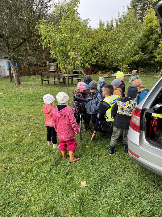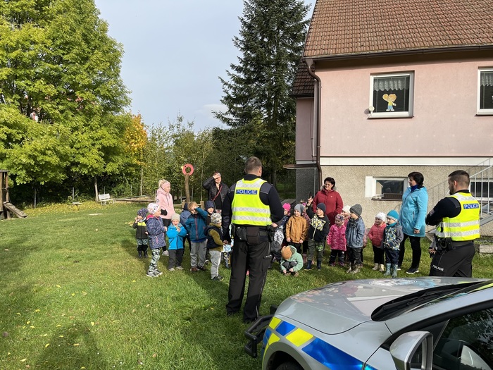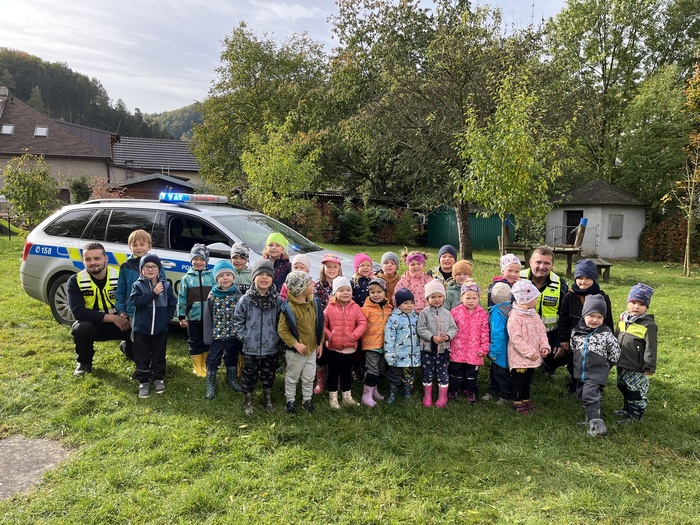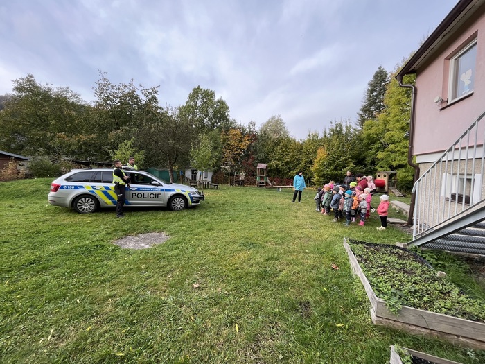 V úterý 24.10. nás na školkové zahradě navštívila hlídka dopravní policie. Pan policista si nejdříve s děti povídal o bezpečném chování na silnicích - přecházení, jízda na kole nebo koloběžce, povinné ochranné vybavení. Poté si s dětmi povídal i o bezpečné jízdě v autě. Děti věděly, že v autě musí sedět v sedačce, že musí být připoutané ony i rodiče. To že se za volantem nesmí telefonovat děti také věděly, tak si vše s panem policistou jen zopakovaly. Pak už nastal čas vyzkoušet si policejní čepici, nechat si nasadit pouta, nebo se podívat policejním dalekohledem až na hrad. Nejvíce se však dětem líbilo výstražné zvukové zařízení na policejním autě. Se zapnutými majáky a houkáním se s námi policisté i rozloučili a děti odcházely do školky plné zážitků.