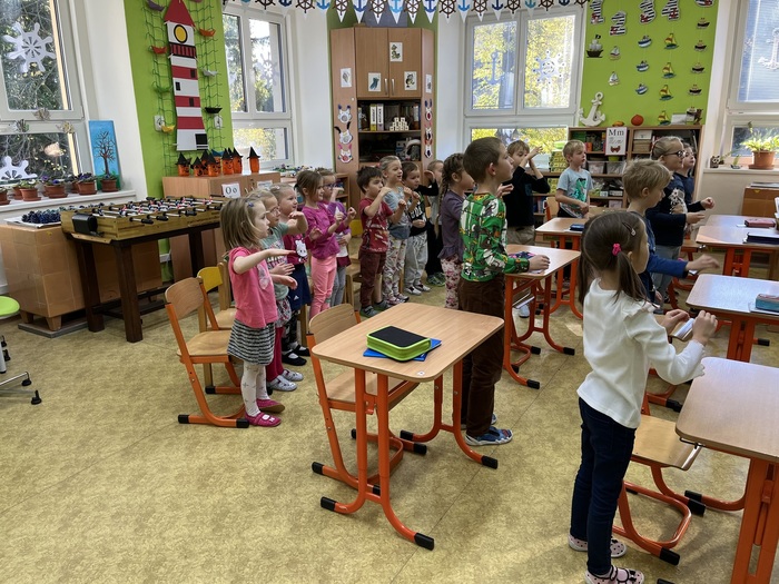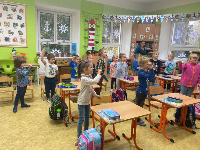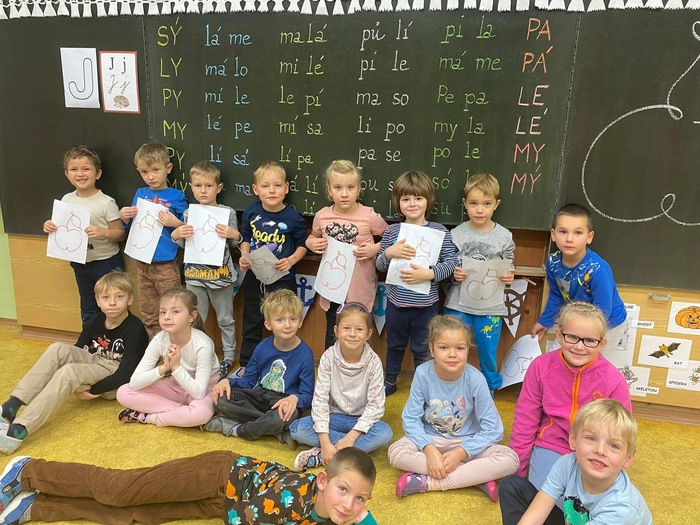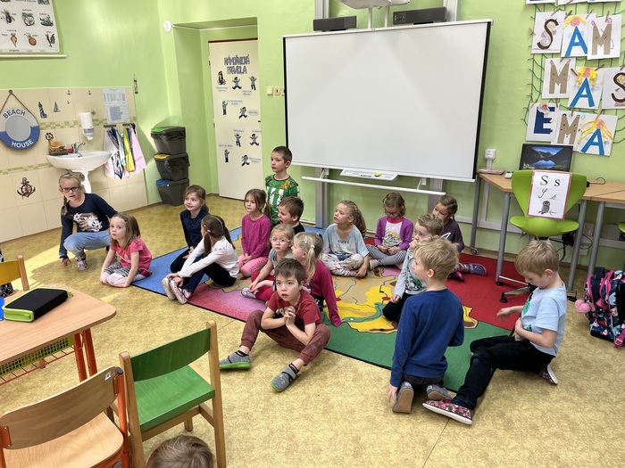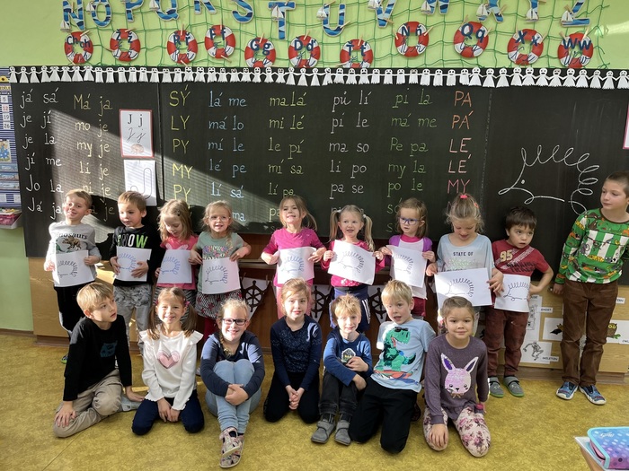 Na úvod si děti vždy zazpívaly písničku, kterou doprovodily pohybem. Poté se seznámily s novým písmenkem, zkoumaly jeho tvar – vymodelovaly si ho, sestavily z různých materiálů. Hledaly také slova, která na písmenko začínají či končí, počítaly a vytleskávaly slabiky, skládaly slova z písmenek. Na závěr si všichni zkusili grafomotorické cviky – tzv. jednotažky. Děkujeme paní učitelce Viktorinové, že děti zapojila do výuky společně s prvňáčky.