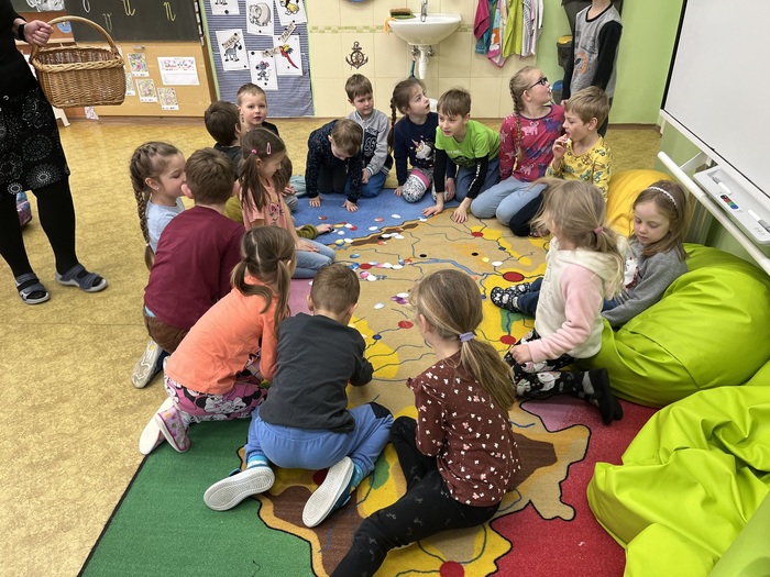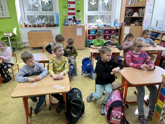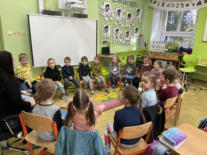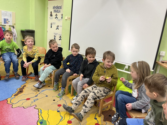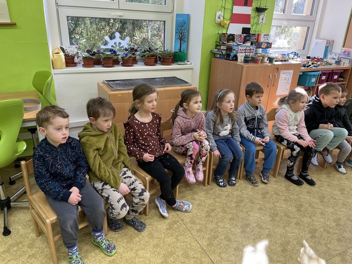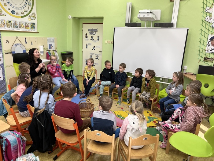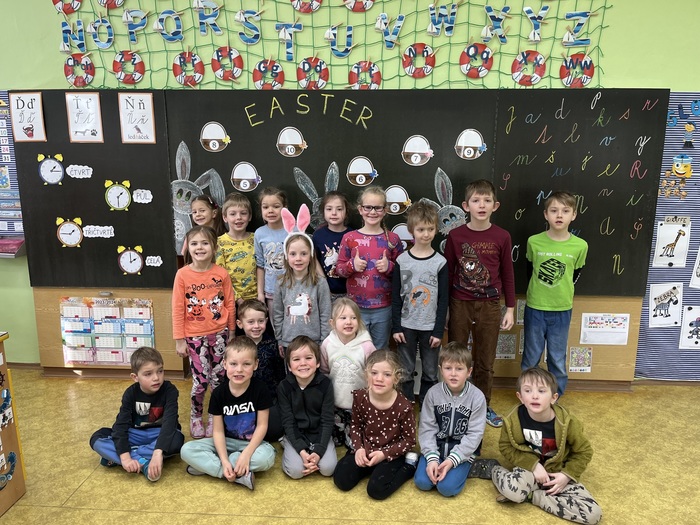 Tentokrát se předškolní děti byly podívat na hodině angličtiny, kde se hravou formou seznamovaly s anglickými slovíčky na téma Velikonoc. Opět spolupracovaly společně s prvňáky. Paní učitelka měla pro děti připravené poutavé aktivity. Zahrály si hru "Easter Bunny" a všichni společně si hodinu plnou zábavy užily.