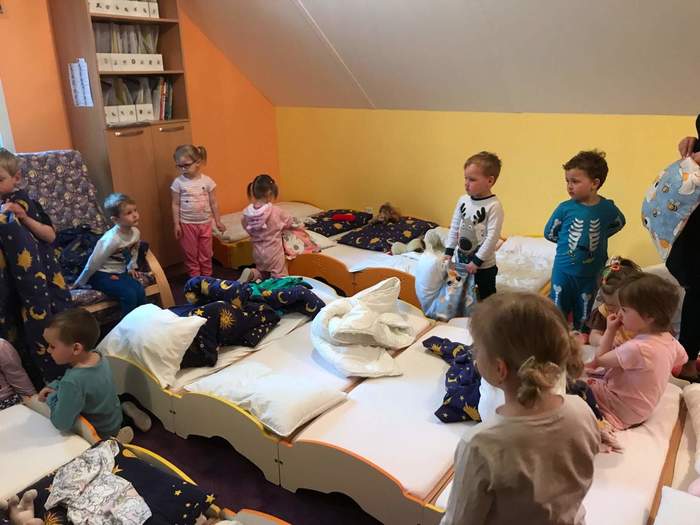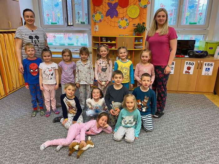 Pro radost jsme pro děti naplánovali „pyžamový den“. Děti měly za úkol přijít v pyžamku rovnou ráno do školky. Ve třídě Berušek jsme si udělali pyžamovou párty s tancem podle hudby a soutěžením o nejlepší tanečníky. S dětmi také tančili jejich oblíbení plyšáci, kteří do postýlek, stejně tak jako pyžamka, patří. Potom jsme si s dětmi vyprávěly „sen“, vymyšlený příběh, kdy každé dítě mělo říci kousek příběhu. Chvíli dětem trvalo, než hru pochopily, ale pak vznikl zajímavý příběh o berušce Emilce. Pak jsme si vyrobily obrázky, kdy si děti prostřihly do papíru tvar pyžamka nebo noční košilky a podlepily to látkou, dokreslily hlavu, končetiny a obrázek dozdobily. Také jsme se seznámili s písničkou Pyžamová párty. V pyžamkách jsme také popřáli Laurince, která měla narozeniny. Protože tento den zrovna pršelo a nešli jsme na procházku, zůstaly děti v pyžamkách až do odpoledne.