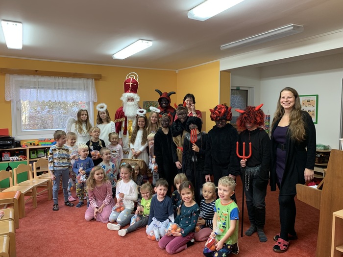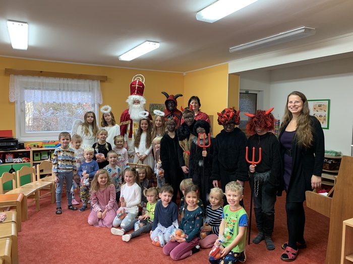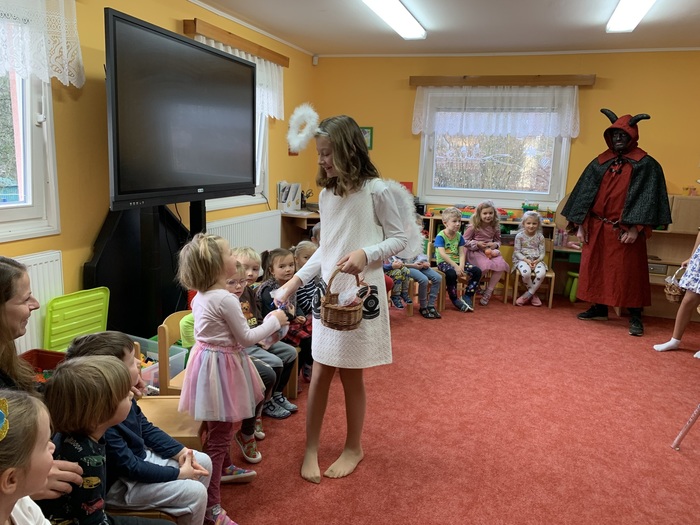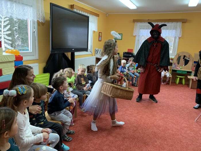 Mikulášova družina se skládala z páťáků, kteří se převlékli za čerty a andílky. Nejdříve navštívili školku a pak se přesunuli do školy.