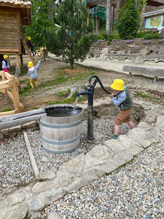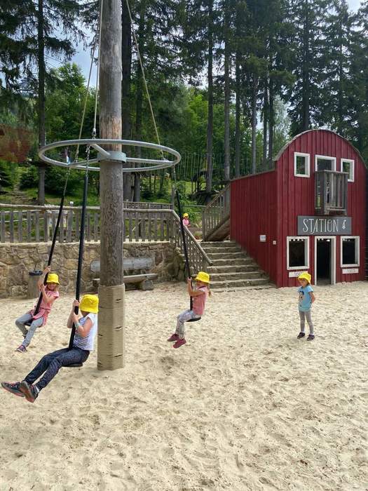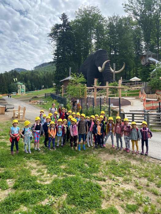 Děti se tohoto dne nemohly dočkat a mluvily o něm již týden dopředu. Stále se ptaly, kdy už konečně pojedeme tím autobusem. Po příjezdu na místo a po vyšlapání malého kopce se před námi objevila dominanta zábavních parků a to obrovský mamut. Děti si nejprve snědly od maminky připravené svačinky a po nabrání sil jsme se mohli vydat za lesními vilami, které na nás již netrpělivě čekaly u vchodu. Víly měly pro děti připravené 4 úkoly. Děti si společně s vílou ukázaly pokusy s vodou, kdy si pomocí krepového papíru vodu obarvily a pak obarvené vody smíchaly tak, že jim vznikly barvy duhy. Dále se snažily pomocí stop odhalit záhadu toho, která zvířátka zavinila požár. Poté si řekly něco o odpadech, jak dlouho se rozkládají a do kterých popelnic je házíme. Nakonec pro děti měla víla připravený kvíz pro chytré hlavičky. Po splnění všech úkolů se děti rozběhly prozkoumávat a užít si park po svém. Mohly si hrát s vodou – pomocí stavidel vodu různě zastavovat nebo roztáčet mlýnské kolo, mohly využít spoustu různých průlezek a klouzaček, také se mohly jít podívat dovnitř mamuta, projít si bludiště nebo se projet na malé lanovce. Po obědě jsme se všichni přesunuli do dalšího parku – pískového, kde si děti také užily spoustu zábavy – mohly rýžovat zlato, vařit z písku, vytahovat písek pomocí kladkostrojů nebo přemisťovat písek na pásech. Po všech zážitcích jsme se již přesunuli k autobusu a vydali se na cestu zpátky. Dětem i paním učitelkám se výlet líbil a moc jsme si ho všichni užili!
