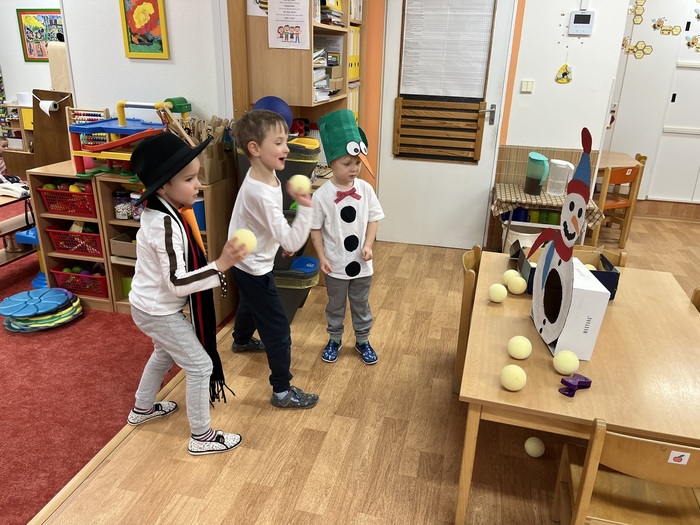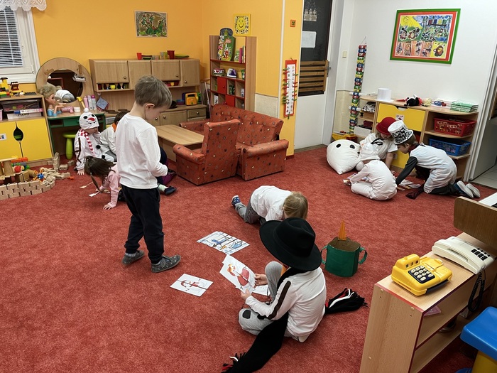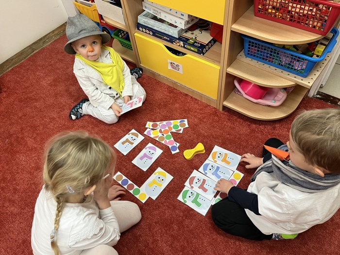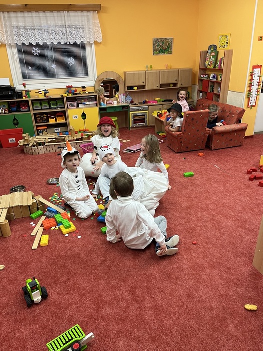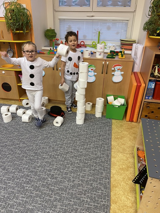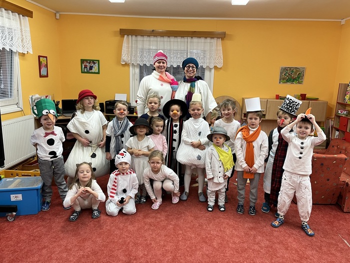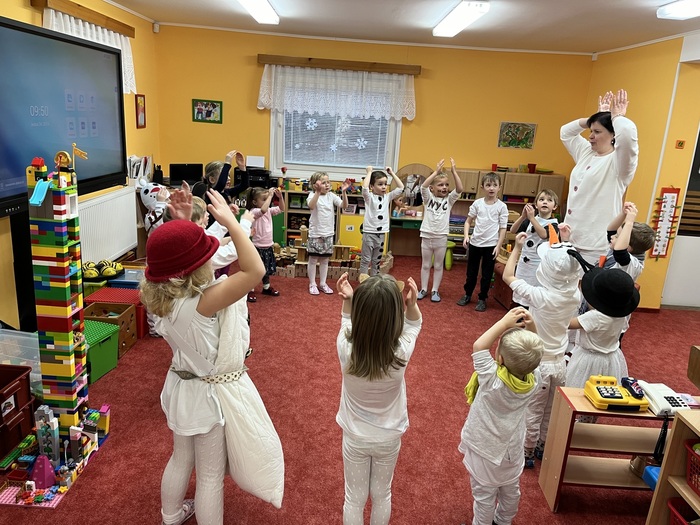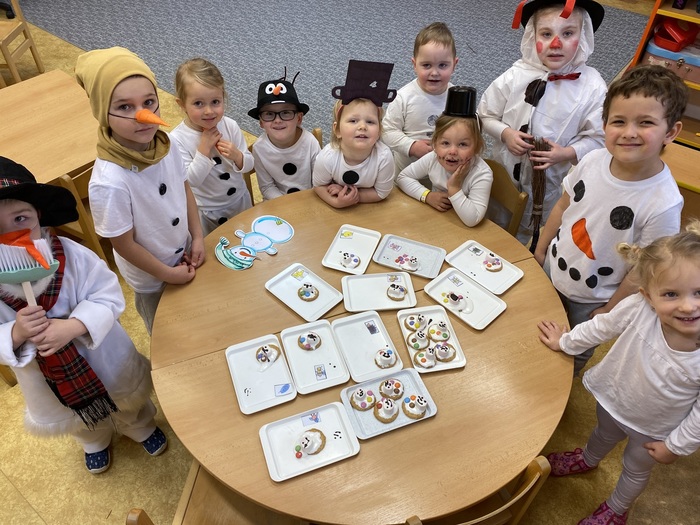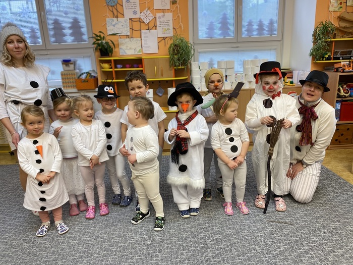 V obou třídách proběhl ve středu 24. 1. Sněhulákový den. Hned od rána přicházely děti do tříd převlečení za sněhuláky. Už cestou ze šatny plnily s rodiči první úkol. A ve třídě na ně potom čekala paní učitelka, také převlečená za sněhuláka a spousta zábavy na toto téma. Vyrobily si sněhuláka z vatových tampónků, nebo ze sušenky, hledaly sněhuláky v závějích (krupice, rýže), sestavovaly obrázky z různých počtů dílků, přišívaly knoflíky, trefovaly se míčkem sněhulákovi do břicha, řadily je podle barev šály, kreslily sněhuláka na velkou interaktivní obrazovku a stavěli sněhuláka z toaletních papírů. Také se naučily písničku a básničku s pohybem, samozřejmě o sněhulácích. Děkujeme rodičům, že dětem připravili tak originální převleky. Všichni jsme si tento den náramně užili.