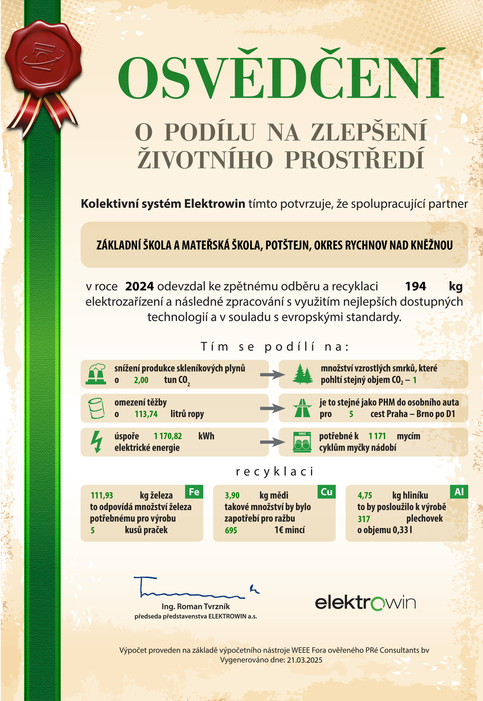 Díky dětem a žákům se naše Základní škola a Mateřská škola, Potštejn, okres Rychnov nad Kněžnou může za rok 2024 pochlubit výsledky sběru vysloužilého elektrozařízení předaného ke zpětnému odběru společnosti Elektrowin o celkové hmotnosti 0,19 t. Ušetřili jsme tak spotřebu elektřiny a snížili produkci skleníkových plynů. Nespotřebovali jsme ropu, železnou rudu, měď a hliník, které jsou potřebné pro průmyslovou výrobu. Nahradili jsme je právě recyklací odevzdaných spotřebičů.