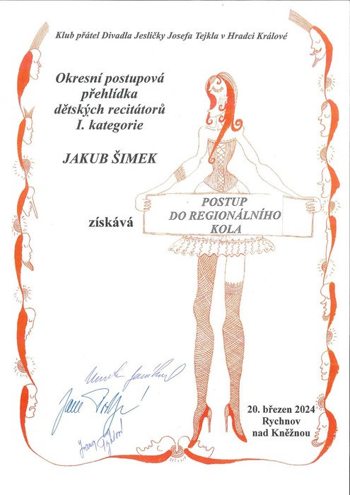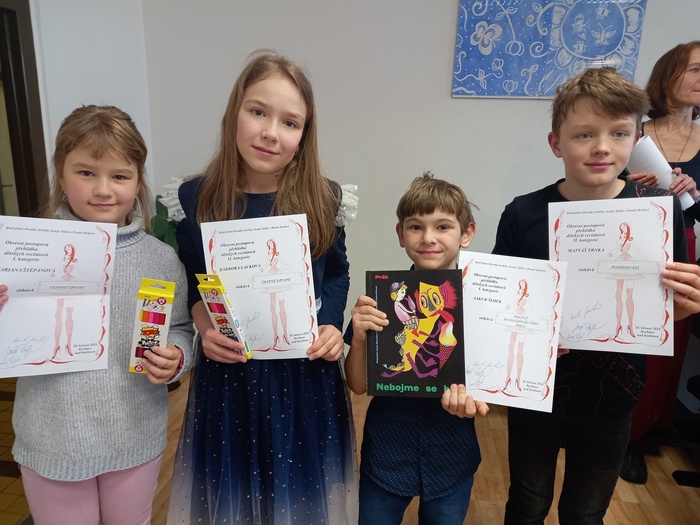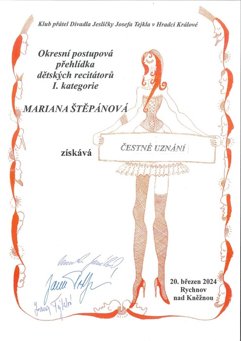 Ve středu 20. března se v Rychnově nad Kněžnou konalo okresní kolo recitační soutěže "Dětská scéna". Soutěžilo se v 1. a 2. kategorii (děti 2. – 5. ročníku ZŠ).