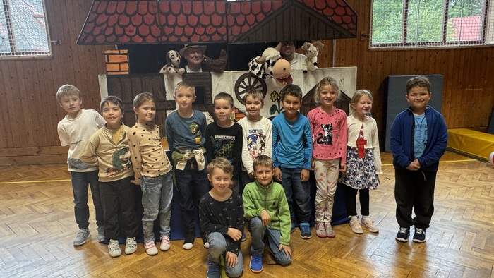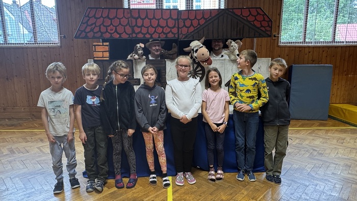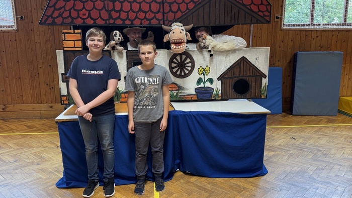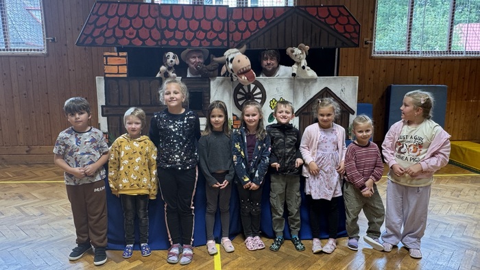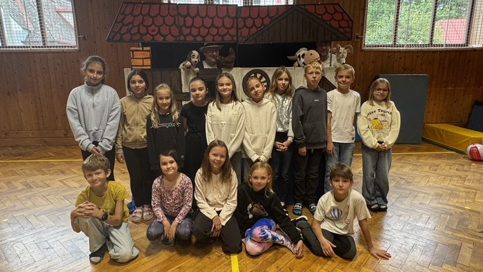 V pátek 26. září žáci zhlédli divadelní představení královéhradeckého Divadélka pro školy s názvem „Pohádky z našeho statku“. Hlavní postavy v podání Víti Troníčka, jakožto průvodce celým dějem ve spolupráci s pejskem Voříškem, a Michala Moravce, který ztvárnil pana hospodáře ze statku, používaly zároveň maňásky ke zprostředkování setkání s ostatními zvířecími hrdiny – slepice, krávy, prasátka, kočky a berana. Vystoupení bylo rozčleněno do tří kratších bloků – pohádek, ze kterých v závěru vyplynulo také nějaké ponaučení. V první pohádce „Jak štěňátko zapomnělo štěkat“ se děti dozvěděly, čím se které zvířátko na statku živí a jakými zvuky se projevuje. Druhá pohádka „O beranovi, který rád trkal“, skončila polepšením berana Matese, který už více do nikoho trkat nechtěl. A ve třetí pohádce „O zloději slepic“ si zase děti připomněly, že pokud něco chceme mít, musíme si to odpracovat. Celé představení bylo velice vtipné a svůj humor si v něm našly děti mladší, některé pasáže zas uvítali i starší žáci. Herci zapojovali diváky do děje a nenásilnou formou jim vštípili, že všichni živí tvorové jsou pro nás užiteční a musíme se k nim chovat slušně a s úctou. Představení bylo prokládáno písničkami i vtipnými scénkami a herci byli ochotni se na závěr s našimi žáky vyfotit na památku.