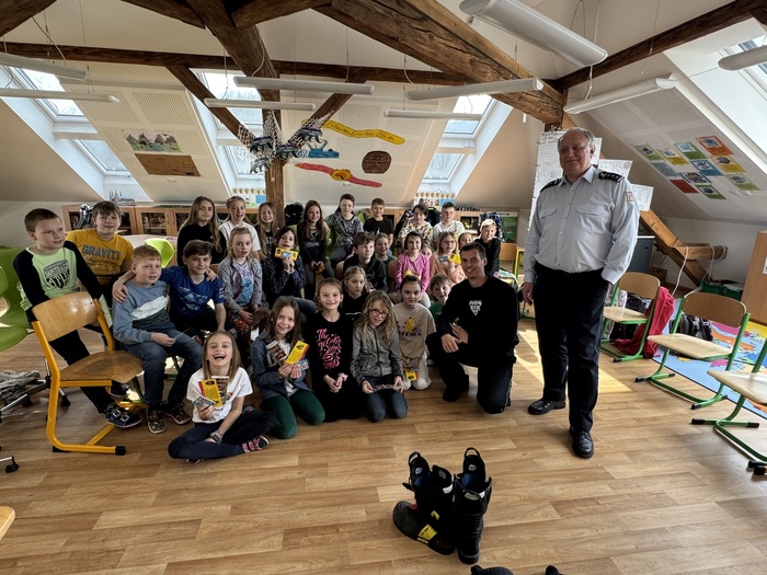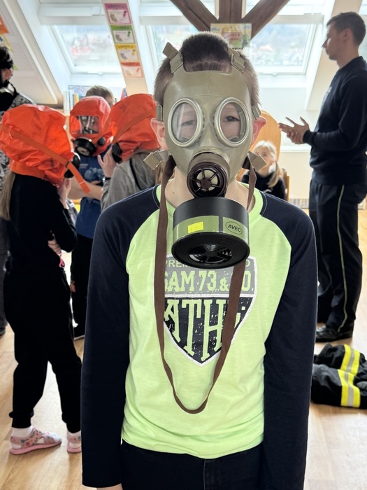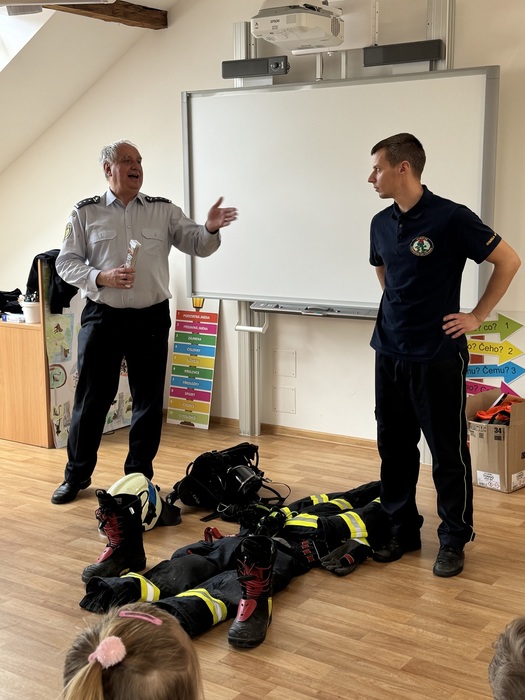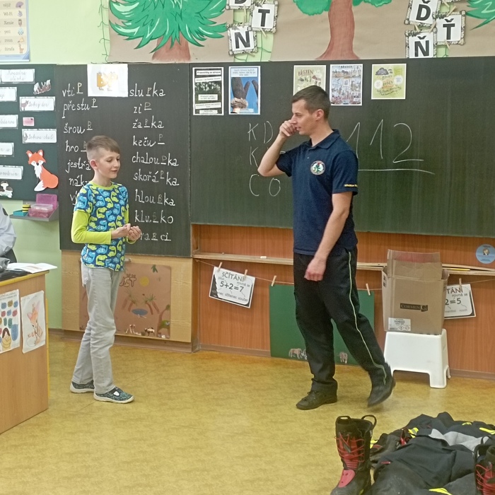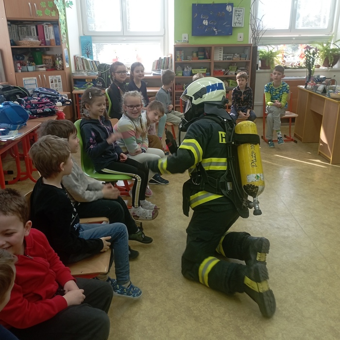 V úterý 25. března naši žáci besedovali s hasiči Adamem a Michalem. Společně si zopakovali, v jakých situacích hasiči zasahují. Hasič Adam se oblékl do speciálního vybavení do útoku, nasadil si dýchací masku a přilbu. Hasiči mluvili s dětmi o důležitých telefonních číslech a zásadách hovoru při volání pomoci. Telefonní hovor si děti vyzkoušely prakticky.