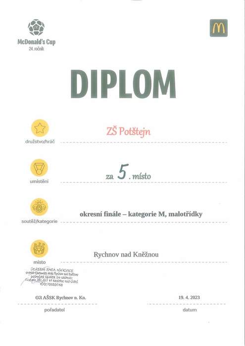 Ve středu 19. dubna se fotbalové družstvo naší školy vydalo do Rychnova nad Kněžnou. Na fotbalovém hřišti s umělou trávou se tam konalo okresní kolo soutěže Mc Donald´s Cup - kategorie M. Ta je určena malým venkovským školám.