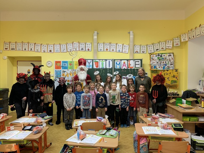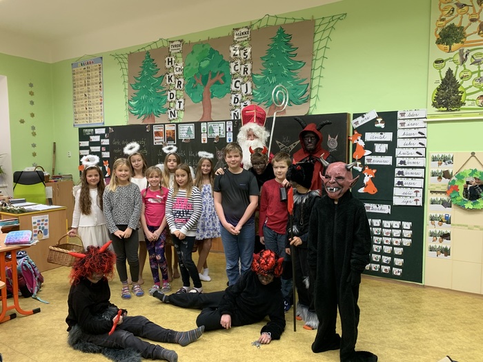 Mikulášova družina se skládala z páťáků, kteří se převlékli za čerty a andílky. Nejdříve navštívili školku a pak se přesunuli do školy. V každé třídě se našel někdo, kdo se bál, protože zlobil, ale nakonec všichni dostali odměnu a do pekla se nikdo nedostal. Ve školce i ve škole jsme si poslechli básničku nebo písničku.