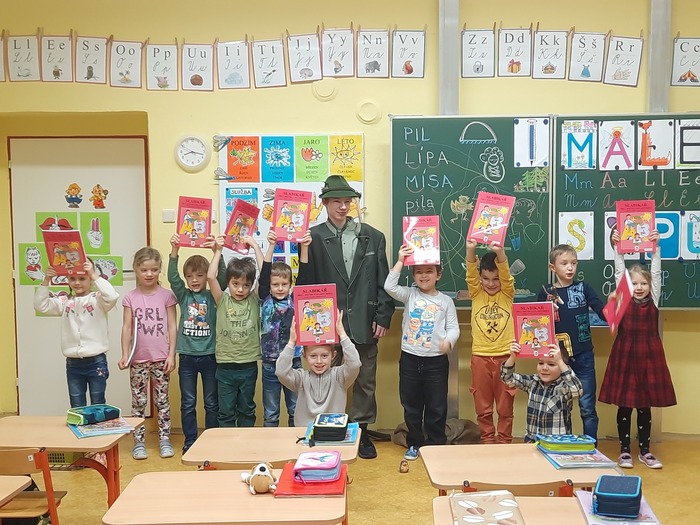 Přišel mezi nás mladý pan myslivec se svými zvířátky. Přinesl také pytel, který prý našel pod starým pařezem - a v něm byly nové Slabikáře!