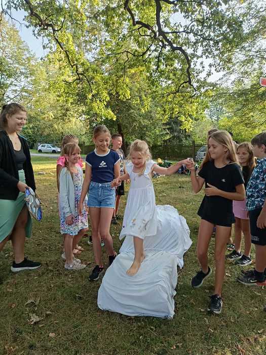 Starší děti se rozmístily okolo připravené "bosochodecké stezky"a dělaly záchranu prvňáčkům. Ti statečně překonávali hory (balíky slámy), krabice plné šišek, kůry, kamínků, fazolí, slámy, ale i lavory s vodou. Takto prošli několika oblastmi - les, hory, poušť, lidská obydlí, louka, pole nebo třeba rybník. Na konci stezky nasedli prvňáčci do traktůrků a šlapali ke škole. Posledních několik metrů vytvořili rodiče a starší školáci nad hlavami dětí bránu, kterou se prvňáci dostali až dovnitř školy.