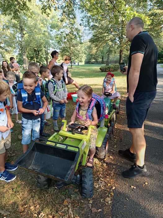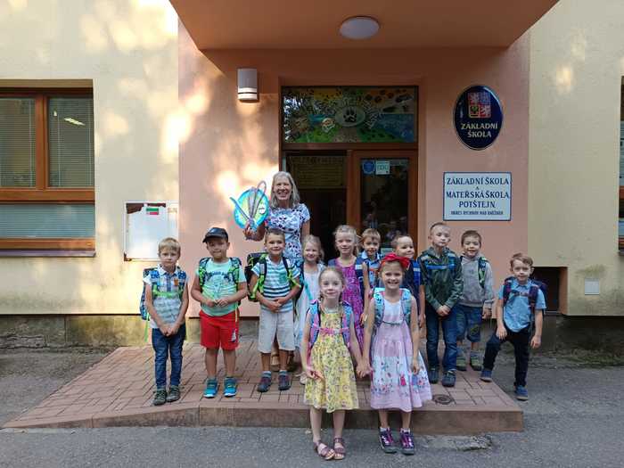 Dvanáct nových prvňáčků nejprve zamávalo svým kamarádům z Mateřské školy a po namalovaných stopách vykročilo do parčíku u školy. Zde paní ředitelka i pan starosta přivítali všechny žáky na začátku školního roku.