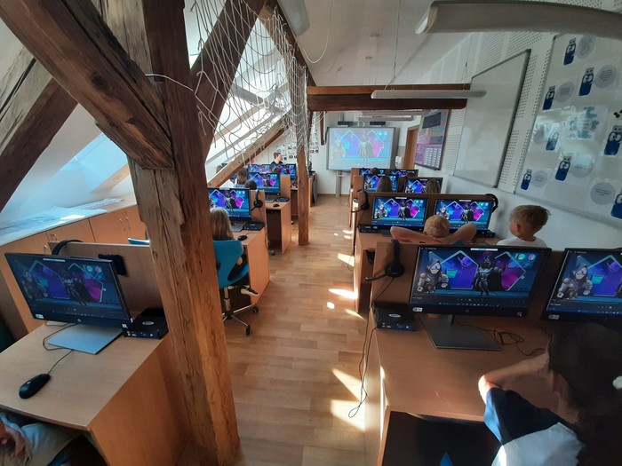 V pátek 5. září se starší žáci aktivně zapojili do preventivního programu neziskové organizace Rubikon. Workshop zaměřený na kyberšikanu při používání AI byl rozdělený do dvou bloků pro 45 minutách. Po úvodním představení hlavních postav – doktora Zlouna a jeho pomocníka Bordelixe – byla žákům přidělena krycí jména, pod kterými vyplňovali kvízy. Lektorka Eliška vždy nejdříve pustila krátké video, následně pak situaci společně se žáky rozebrala a závěrem si všichni ověřili své znalosti v celkem deseti kvízech. V prvním bloku se jednalo o důležitost silného, ale zapamatovatelného hesla, neposkytování osobních údajů, nebezpečí možného zneužití fotek či videí, riziko poplatků při hraní internetových her a varování před modrým světlem nebo přílišným trávením času na mobilu nebo počítači.