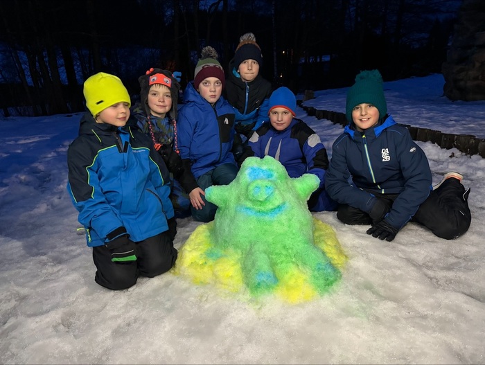 Ve čtvrtek jsme se probudili do krásného slunného dne, proto jsme celý den lyžovali a zdokonalovali se v lyžařských dovednostech. Oddíl našich začátečníků nejen úspěšně vyjížděl samostatně na pomě a sjížděl bez pomoci celou sjezdovku, ale i se účastnil různých zábavných lyžařských cvičení (např. živého slalomu nebo mašinky) i s jinými zdatnějšími družstvy. Před večeří jsme vyrazili opět ven, tentokrát bez lyží – tvořili jsme sněhové stavby, které jsme nakonec obarvili. Večer nás pobavila skupinová taneční vystoupení a následovala dlouho očekávaná diskotéka.